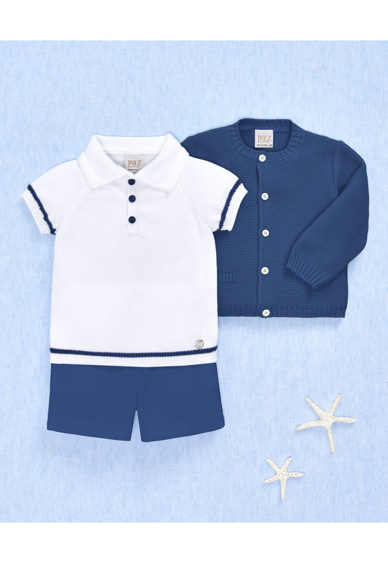The Marino Set is a two piece set that includes a white knitted polo with stylish blue trims, and comfortable navy blue shorts with an adjustable button waistband.