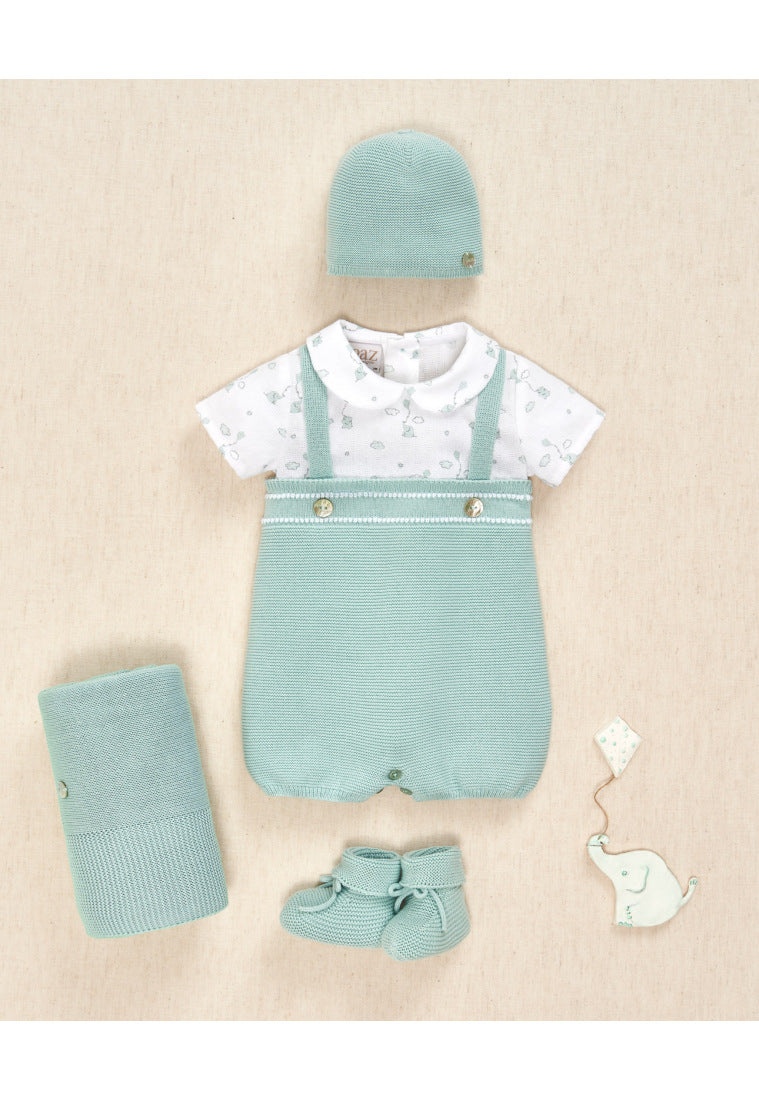 Description: The Rodri Romper is made with a cotton top featuring charming elephant and cloud designs, and a soft knitted bottom. Perfect for little boys who want to stay stylish and cozy.